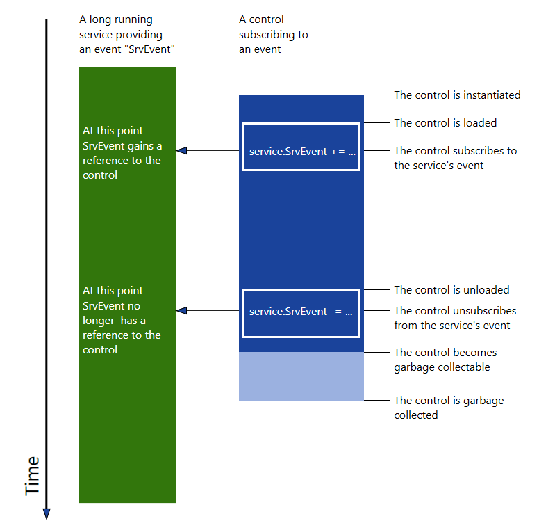 The problem arises when the object C does not unsubscribe from the event. In that situation the event will retain its reference to object C and that will cause object C to leak in memory. Fixing this scenario is straightforward: the client code should at some appropriate moment unsubscribe from the events it subscribed to. What the “appropriate moment” is depends on the situation. For example, a control could subscribe to such events when loaded and unsubscribe from them when unloaded. There are cases however when finding the appropriate moment to unsubscribe is difficult and setting up the correct subscribing / unsubscribing mechanism can be a complex undertaking.